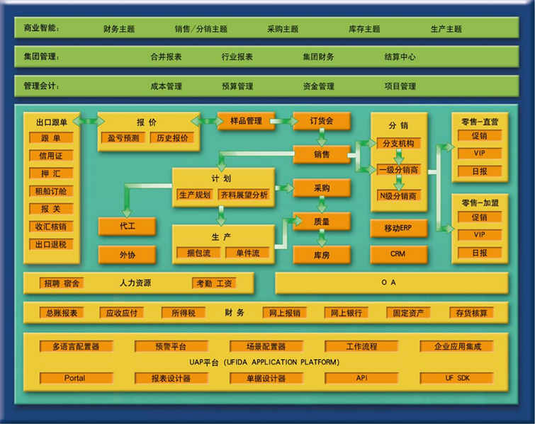 用友 U8 服裝行業(yè)解決方案由分銷、零售、產(chǎn)品數(shù)據(jù)管理、訂貨會、模擬接單、出口、計劃和生產(chǎn)、倉儲與條碼、訂單全生命周期、集團 管理模式、UAP 等組成,解決了服裝服飾企業(yè)從外部的銷售渠道管控到內(nèi)部的生產(chǎn)管理、成本核算等重要業(yè)務(wù)問題。