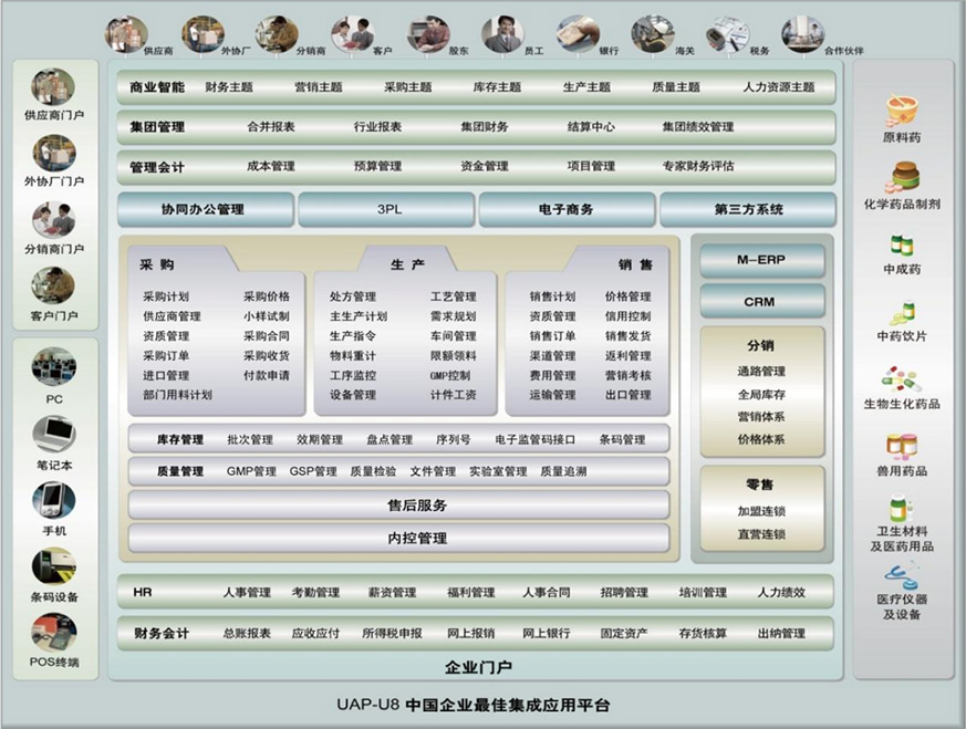 用友 U8 醫(yī)藥行業(yè)解決方案關(guān)鍵應(yīng)用架構(gòu)圖